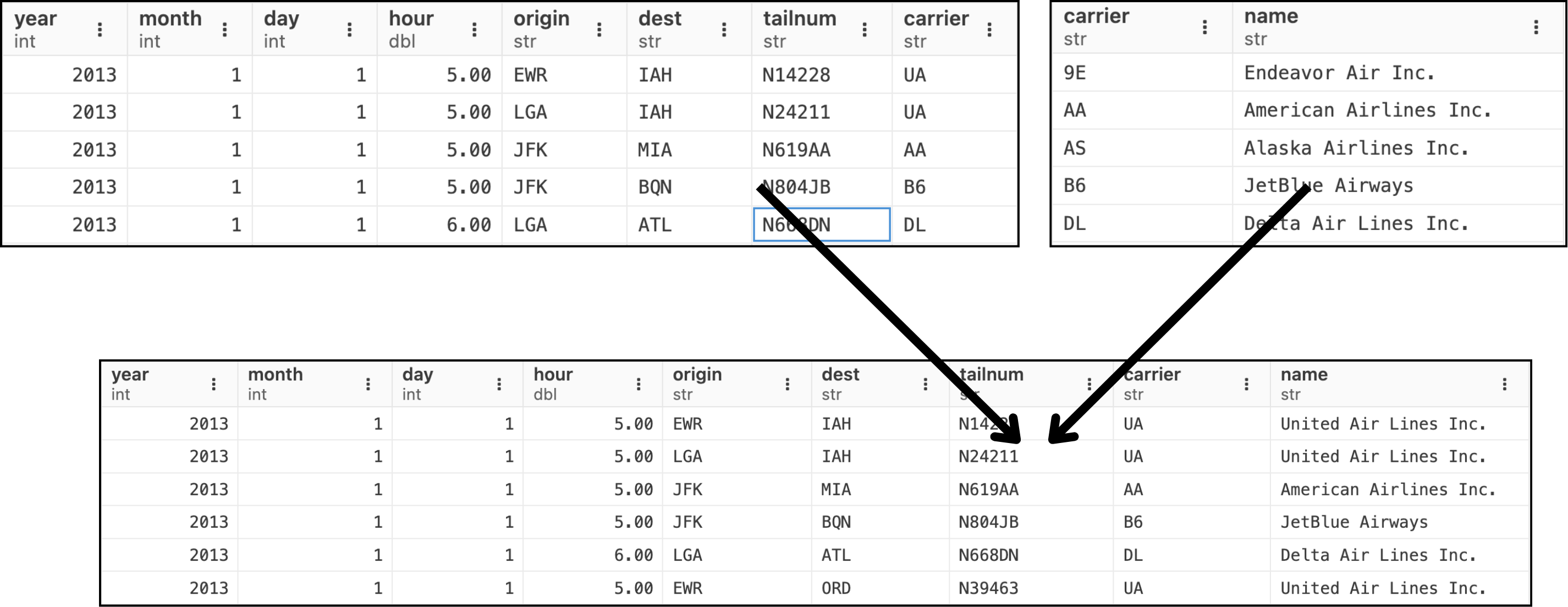 We want to have the full name of the airline in the flights2 table rather than the carrier abbreviation.